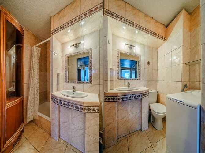 Łazienka razem z WC, wyposażona w prysznic, umywalkę i pralkę.