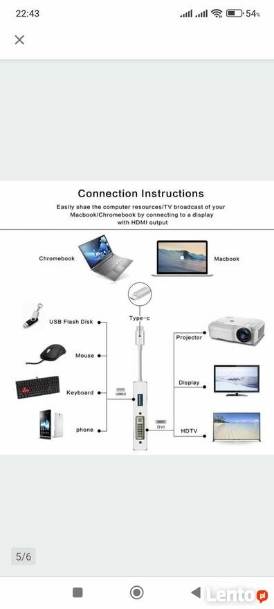 Adapter pozwalający podłączyć przez port USB-C laptopa, macbooka, chromebooka, smartfona lub inne urządzenia z gniazdem USB-C do telewizora, monitora lub projektora wyposażonych w jeden z portów: HDMI, VGA lub DVI. Dodatkowy port USB 3.0 obsługuje transmisję danych o szybkości 5 Gb/s, obsługuje urządzenia peryferyjne USB takie jak myszkę, klawiaturę, pamięć flash, dysk.