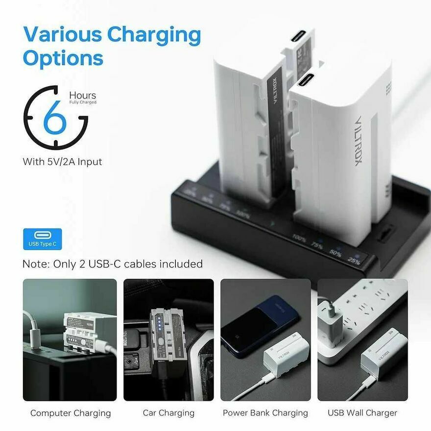 Dwa wydajne akumulatory: 2 zapasowe akumulatory NP-F970 o większej pojemności 7,4 V 6600 mAh/48,84 Wh i 2 kable ładujące TYPE-C, aby zapewnić, że Twoje wyposażenie oświetleniowe pozostanie oświetlone przez cały czas nagrywania i uchwycenie każdego wspaniałego momentu. Wskazówki: Ten akumulator z serii NP-F nie jest kompatybilny z kamerami i kamerami.