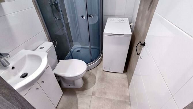 Łazienka: kabina prysznicowa, pralka, WC, umywalka.