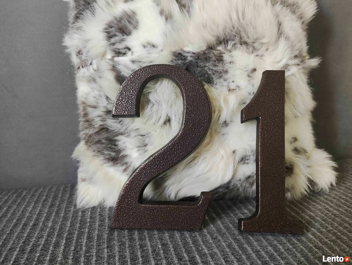 Numer domu lub mieszkania w kolorze brązowym. Wykonany z trwałego materiału, idealny do oznaczenia drzwi wejściowych. Wymiary 21 x 12 cm zapewniające dobrą widoczność.