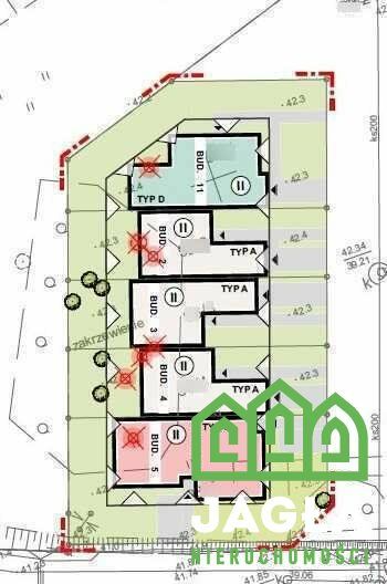 Dwa budynki typu C (j.w), trzy budynki typu - A (121m2) i jeden budynek typu D (154m2).