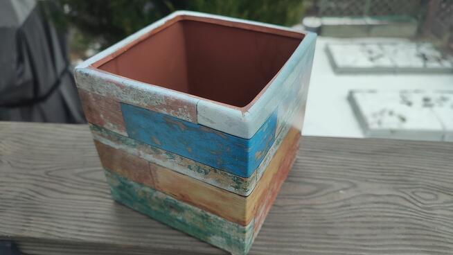 Osłonki na doniczki gliniane. Komplet 4szt Na zewnątrz kolorowy druk na PCV Dobrze wykonana, folia nie marszczy się ...