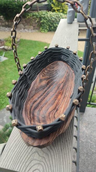 Stan bardzo dobry. Ręcznie robiony koszyk z elementami drewna, stalowe nity i uchwyt oraz linka. Kosz lata 50. Styl ...