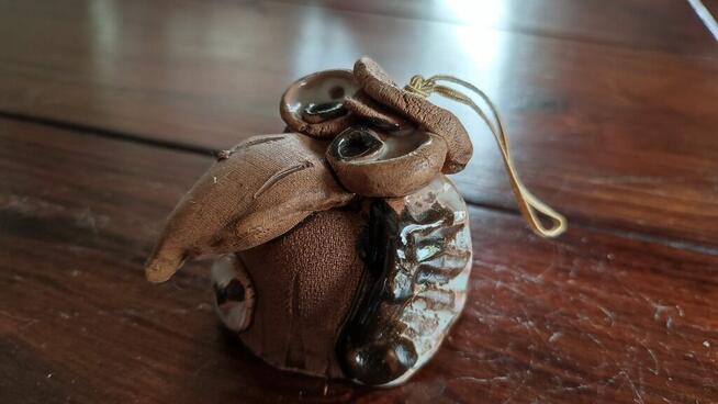 Dzwonek pochodzi z prywatnej kolekcji. Ręcznie robiony. Glina wypalana, politura. Wysokość całkowita ok. 5,5cm
