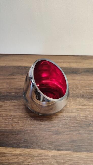 Świecznik w kolorze zewnętrznym lustrzano-niklowym i wnętrzem czerwonym. Ciekawy i nie tuzinkowy, ręcznie ...