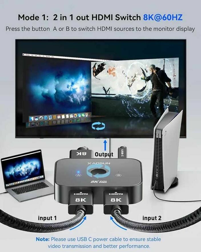 Plug and Play, nie wymaga brudzenia: rozdzielacz XAOSUN HDMI 8K 4K Ultra HD jest łatwy w instalacji i obsłudze. Dzięki trybowi przełączania za pomocą jednego przycisku wystarczy podłączyć urządzenia i gotowe.