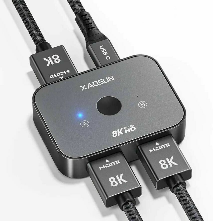 XAOSUN Przełącznik HDMI 2.1 8K, dwukierunkowy rozdzielacz HDMI 48 Gb/s, 1 w 2 wyjścia/2 w 1, 8K przy 60 Hz, 4K przy 120 Hz, przełącznik do HDR, 3D, Dolby, Switcher do PC, Xbox, HDTV, PS5/PS4, Roku