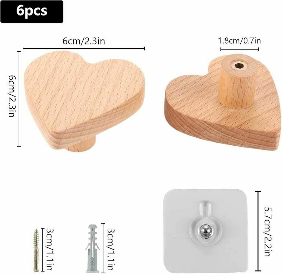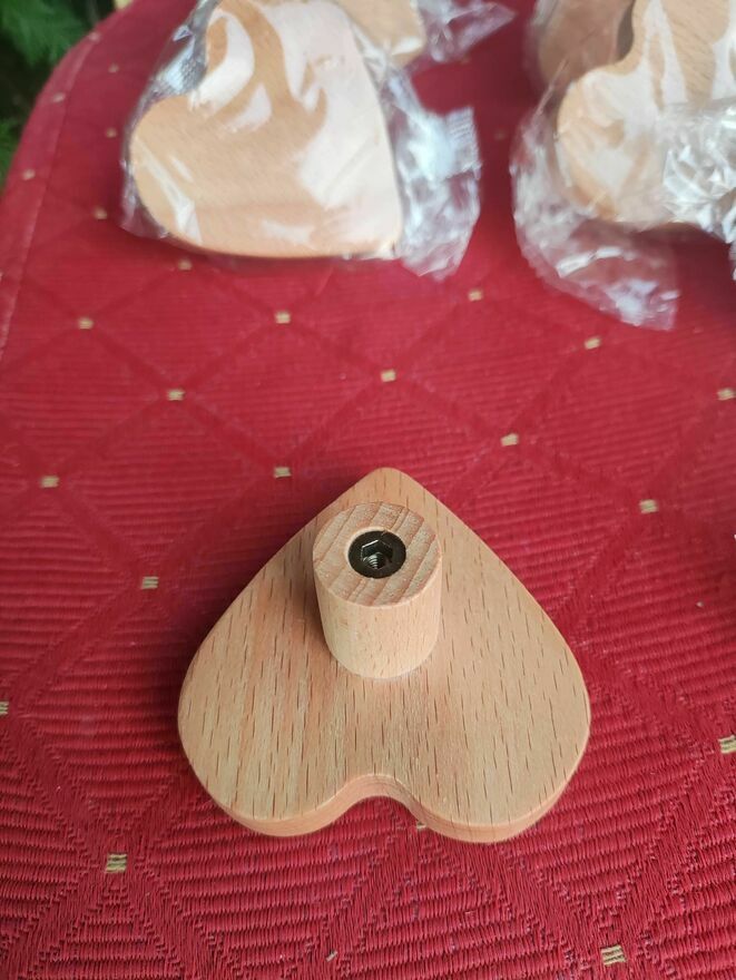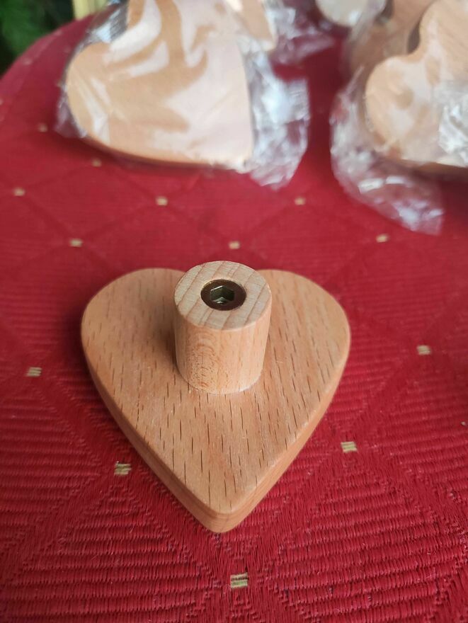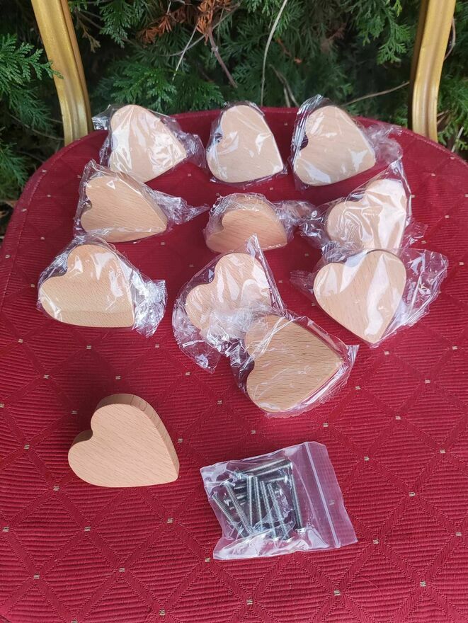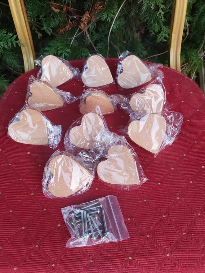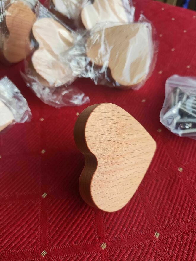 Zestaw drewnianych gałek i uchwytów do mebli, szafek i komód. Wykonane z drewna w kształcie serc, zapakowane indywidualnie. Idealne do nadania niepowtarzalnego charakteru Twoim meblom.Nowe.