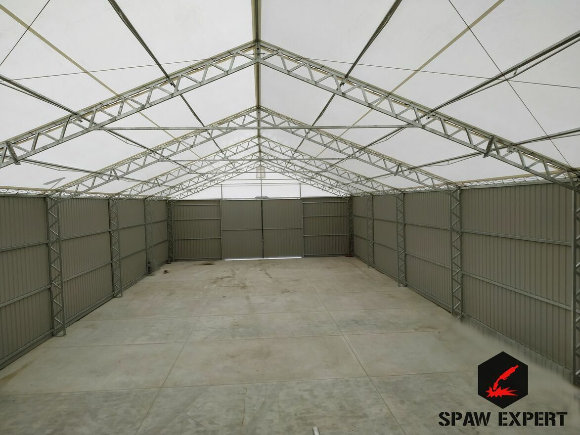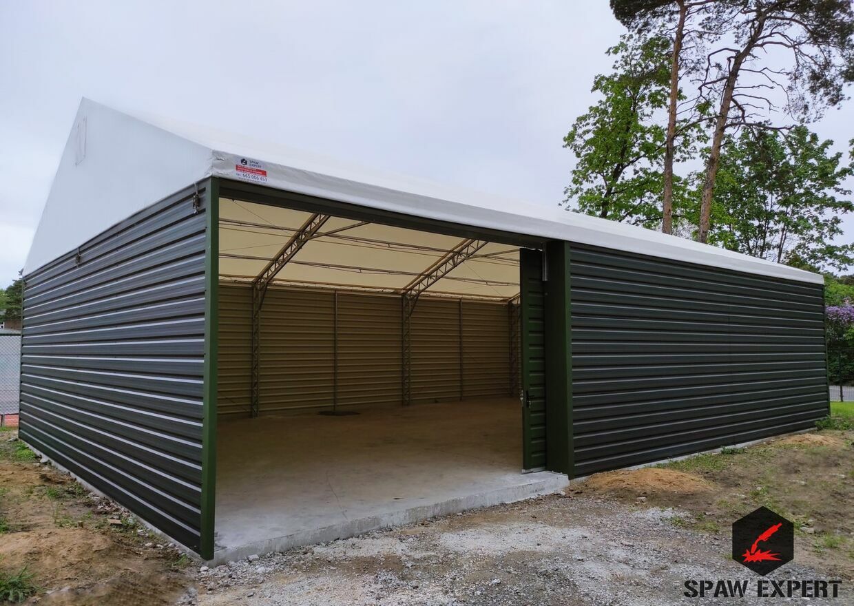 Konstrukcja stalowa jest zabezpieczona antykorozyjnie przez proces cynkowania ogniowego. Materiał dachowy to plandeka o gramaturze 680gr/m2, natomiast boki to blacha trapezowa T 18.