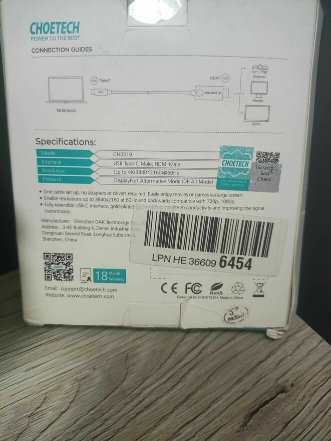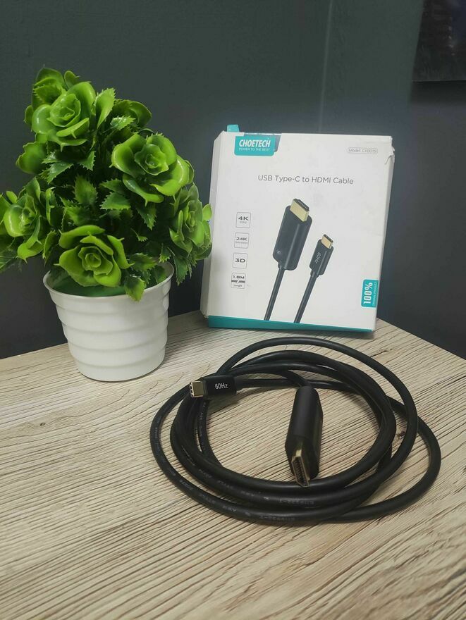 Kabel USB-C do HDMI marki Choetech. Model CH0019. Przejściówka umożliwiająca podłączenie urządzeń np telefonu, tableta, laptopa Notebooka projektora z portem USB-C do monitora czy telewizora za pomocą złącza HDMI.Nowy.