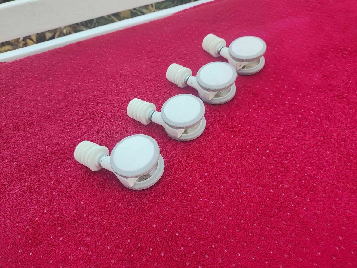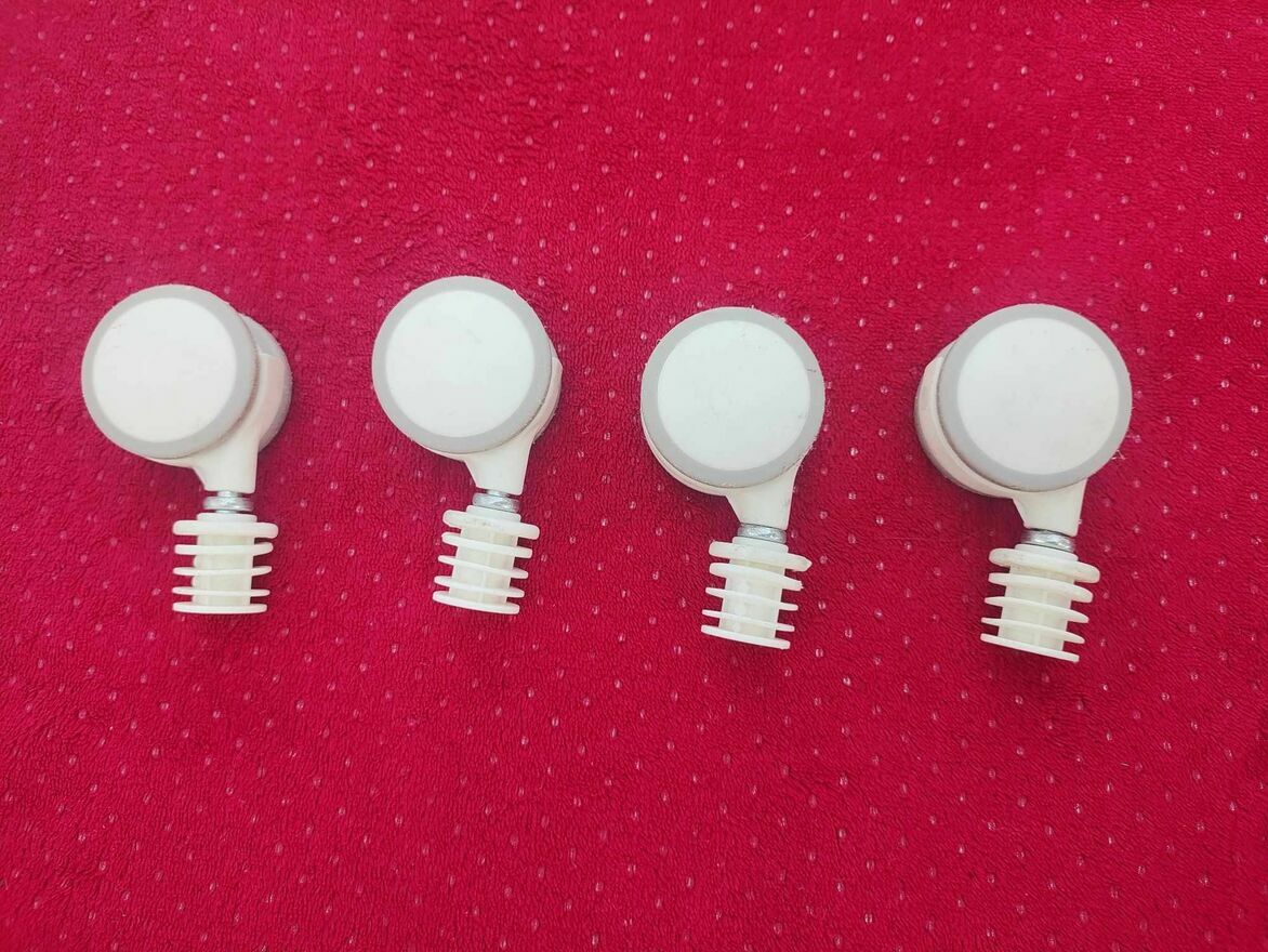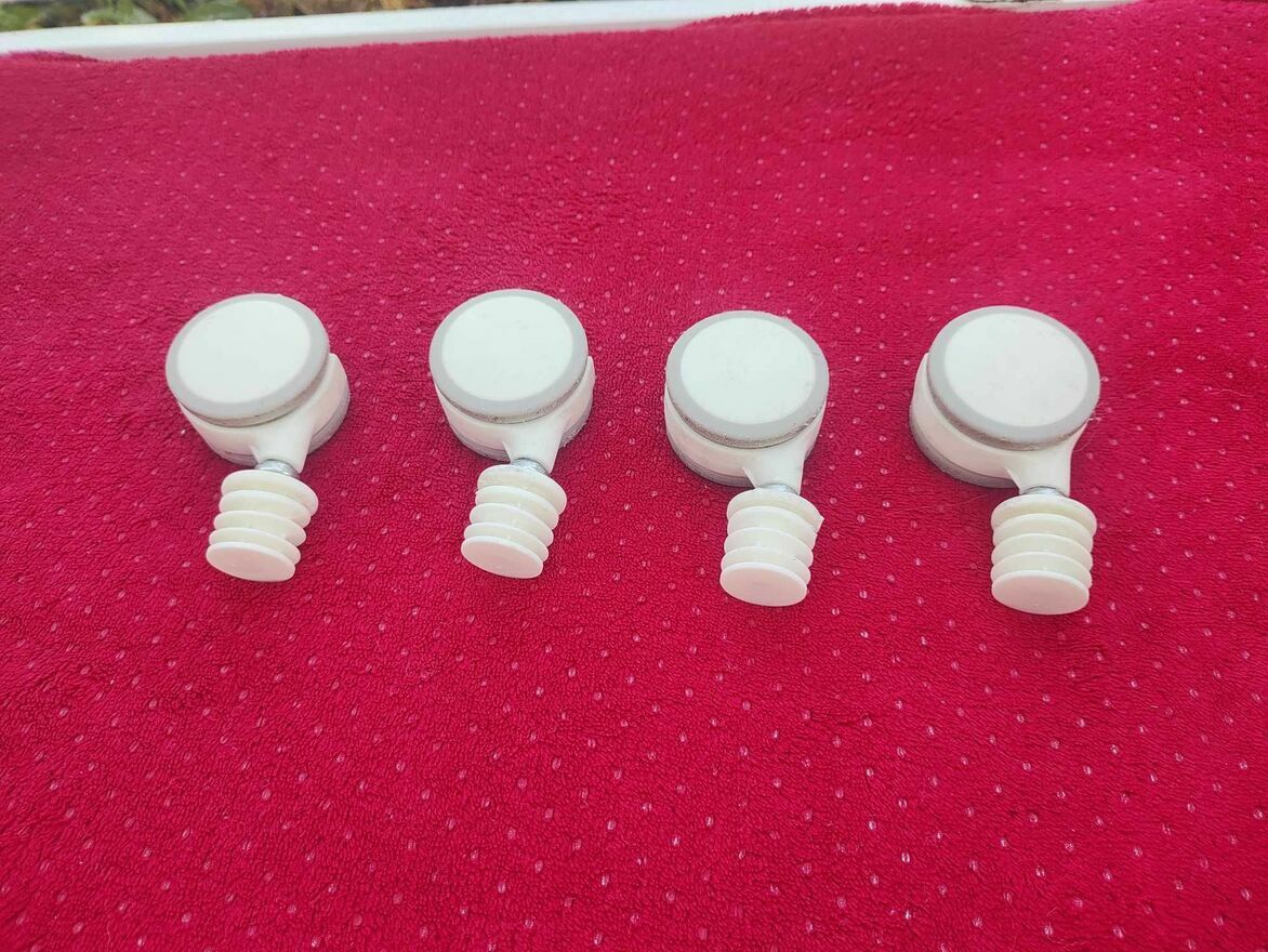 Białe kółka obrotowe do wózka, szafki lub innego mebla. Zapewniają łatwe przemieszczanie się i stabilność. Doskonale sprawdzą się w różnych zastosowaniach domowych i biurowych.