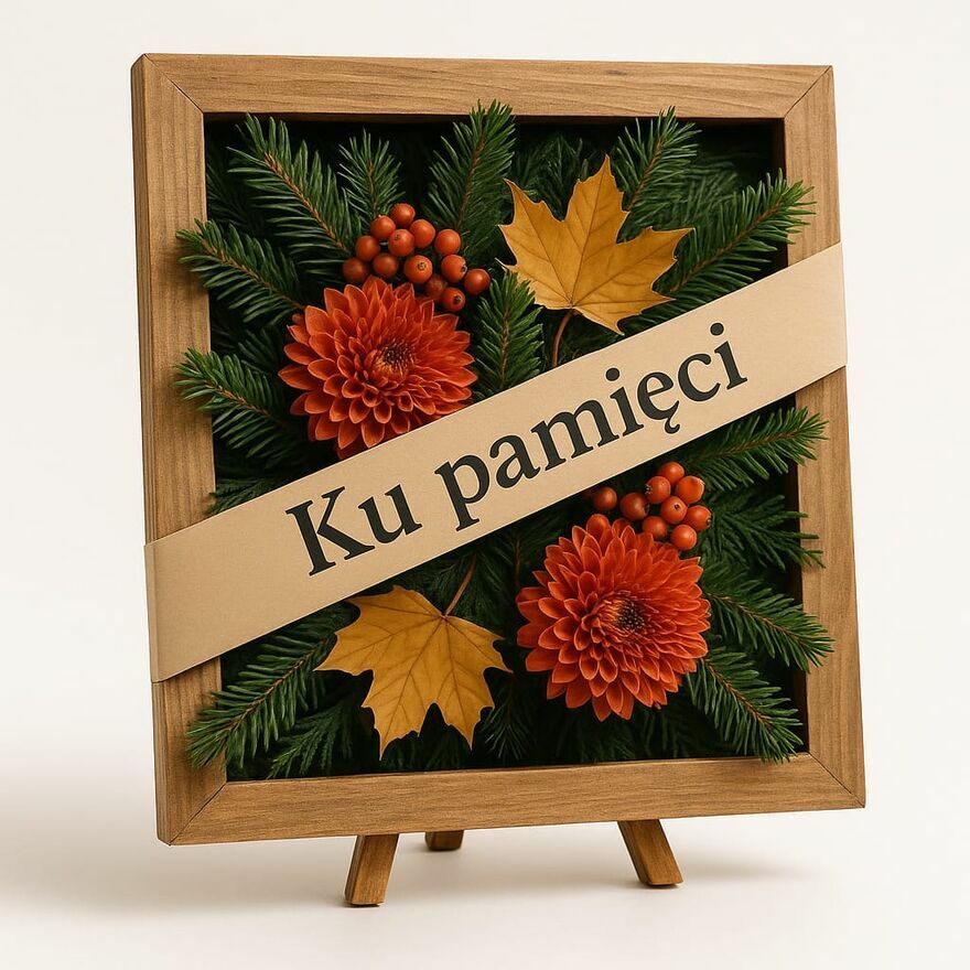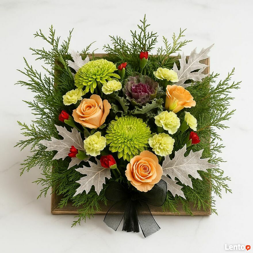 Piękna kompozycja kwiatowa w drewnianej ramie, pełna jesiennych barw i tekstur. Znajdziemy tu żółte chryzantemy, pomarańczowe róże, fioletowe goździki oraz zielone liście. Całość tworzy elegancką i dekoracyjną dekorację, która doskonale sprawdzi się jako prezent lub ozdoba w domu wiszącą lub stojącą a w obecnej chwili alternatywą dla tradycyjnych wiązanek różne wymiary rompozycjw możliwość zrobienia z żywych roślin lub sztucznych szybkie realizację ręczna robota wysyłki lub dowóz do 50km od Bydgoszczy Cena zależności od rozmiaru ramki i czy kompozycja świeża mieszana lub sztucznaDo kompozycji nagrobnych montowane są przyssawki
