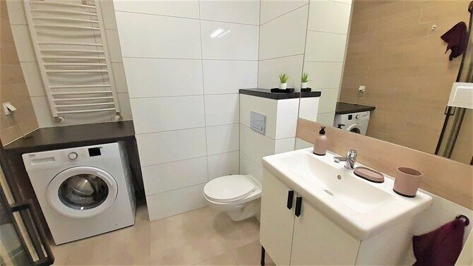 Łazienka: kabina prysznicowa, pralka, WC oraz umywalka.