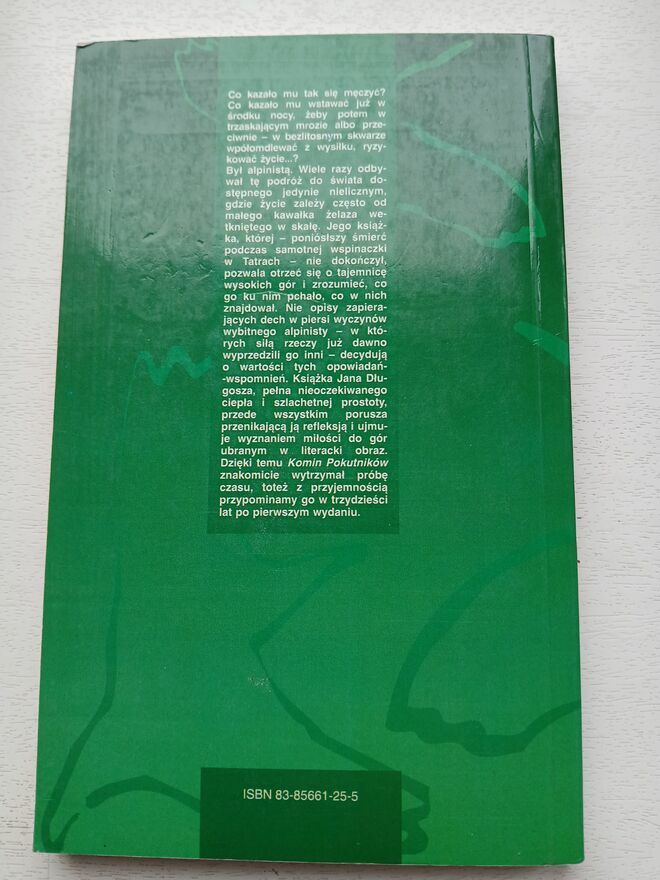 ISBN 83-85661-25-5"Komin Pokutników to proza wyrastająca z doświadczenia. Jan Długosz był wybitnym taternikiem i alpinistą mającym potrzebę literackiego destylowania swoich górskich przeżyć. Był osobowością artystyczną, jak wielu ludzi gór przed nim i po nim. zdawał sobie sprawę z istnienia fascynującego zjawiska kulturowego zwanego piśmiennictwem tatrzańskim czy szerzej literaturą górską , i świadomie wpisywał się w ten żywy strumień polskiej refleksji o człowieku wobec żywiołu gór, o jego uczestnictwie w grze między kulturą i naturą. Pozostawił po sobie środowiskową legendę. Na szczęście to nie tylko to. Komin Pokutników to coś więcej niż klasyka literatury górskiej , to intrygująca proza artystyczna zakorzeniona i w naszej tradycji literackiej, i w życiu jej autora."