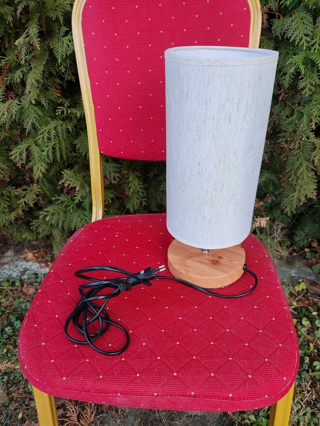 Lampa stołowa z drewnianą podstawą i abażurem. Idealna do oświetlenia biurka lub stolika. Wykonana z wysokiej jakości materiałów, zapewnia przyjemne i ciepłe oświetlenie.Nowa.