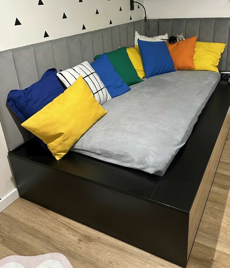Oddam łóżko wykonane na zamówienie o wymiarach 240x130cm; powierzchnia spania 90x200 (materac). Skrzynia na pościel. Materac wysokiej jakości grubości 30cm.Obecnie łóżko zostało zdemontowane, elemety całe. Wymaga złożenia. Potrzebne będą wkrętarka / śrobokręt, trochę kleju montażowego oraz 3 - 4 nowe plastikowe elementy (łącznik narożny płyt ; koszt około 15zł za 10szt). W zestawie komplet wkrętów.