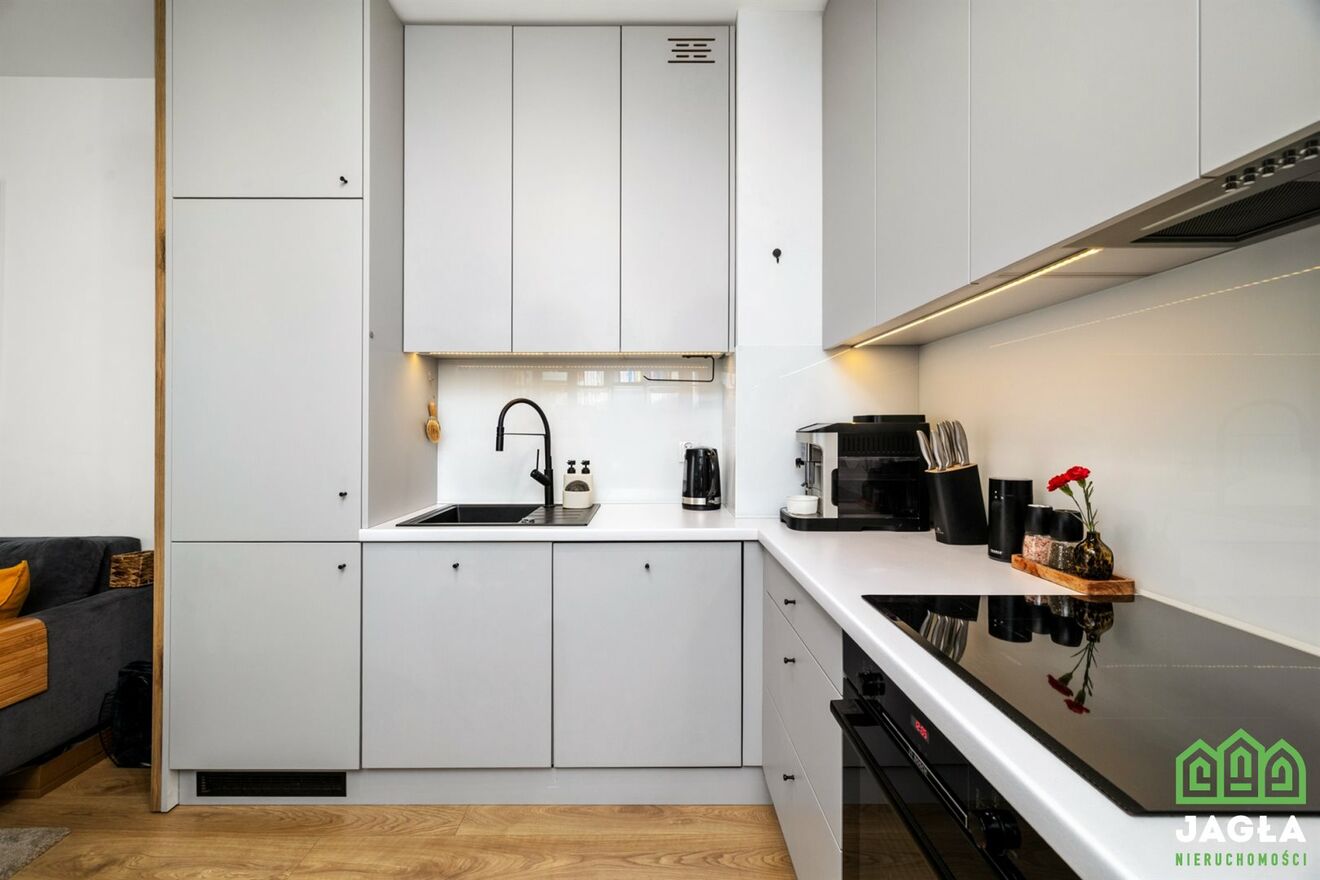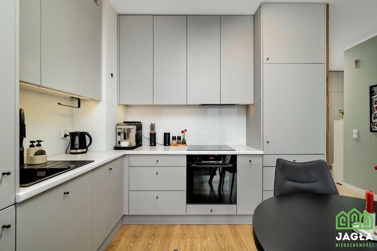 Kuchnia wyposażona w sprzęty Bosch i Samsung. Drzwi antywłamaniowe do mieszkanie. Plisy w oknach.