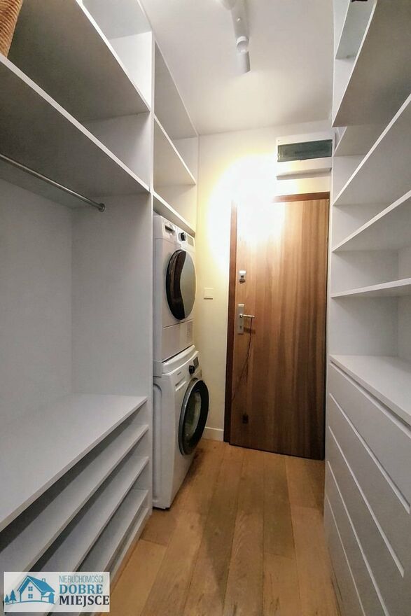 - funkcjonalna garderoba z dużą ilością miejsca do przechowywania rzeczy, wyposażona w pralkę i suszarkę bębnową.