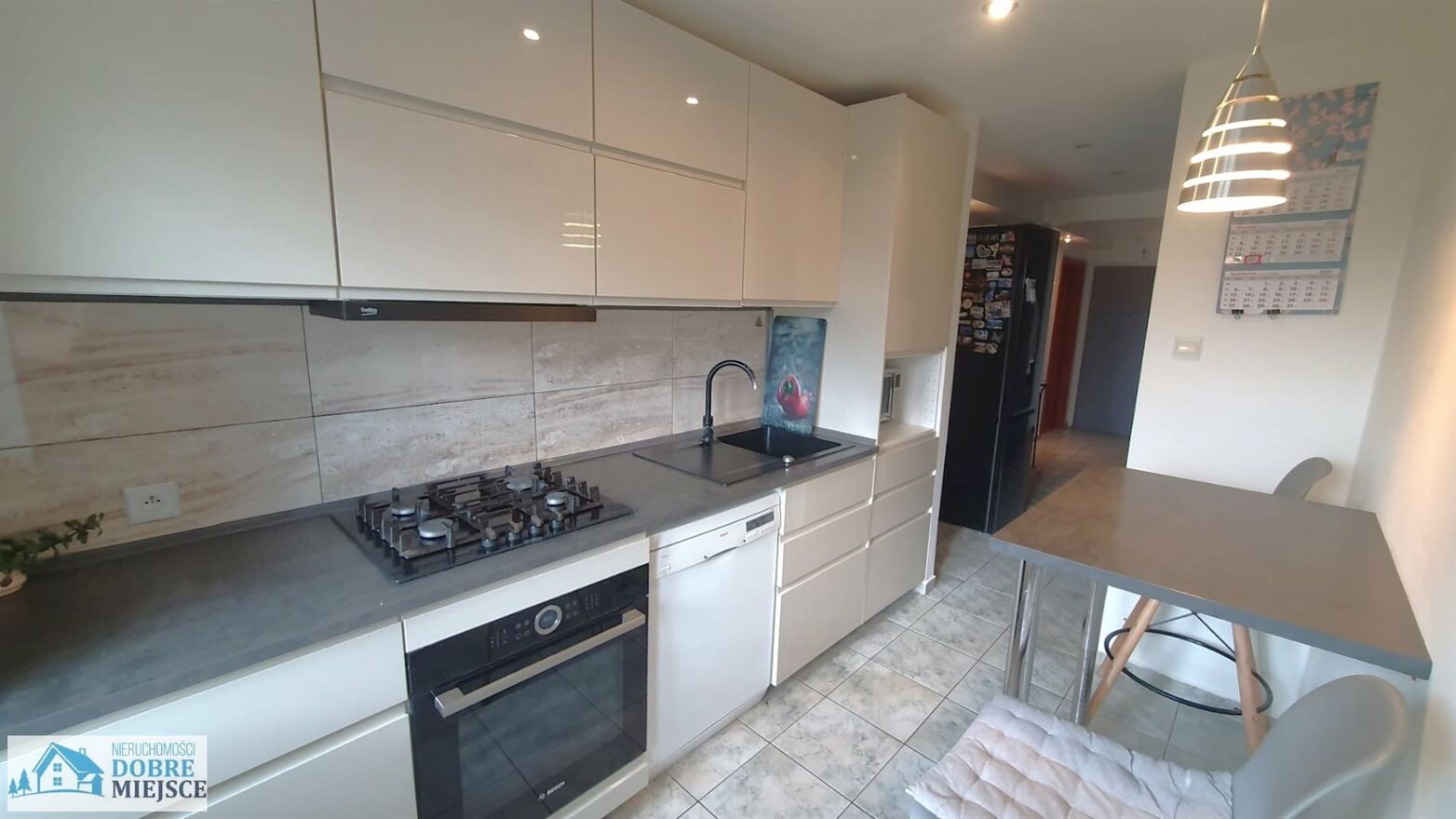 - KUCHNIA - 7 m² - jasna i przestronna, nowoczesna zabudowa meblowa pod sufit - kuchenka gazową, piekarnik, okap, zmywarka, bardzo dużo szuflad i szafek, blat i stół tworzą jednolity komplet;