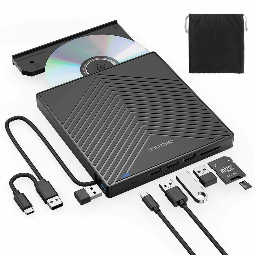 ORIGBELIE Zewnętrzna nagrywarka DVD CD, zewnętrzny odtwarzacz DVD, USB 3.0 z 4 portami USB i 2 czytnikami kart TF/SD, ultra cienki zewnętrzny napęd CD/DVD do laptopa z systemem Windows