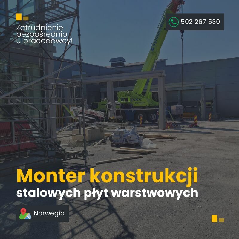 Monter konstrukcji stalowych / płyt warstwowych – NORWEGIANorweska firma Sivert Montasje AS szuka monterów do pracy przy halach i budynkach komercyjnych.