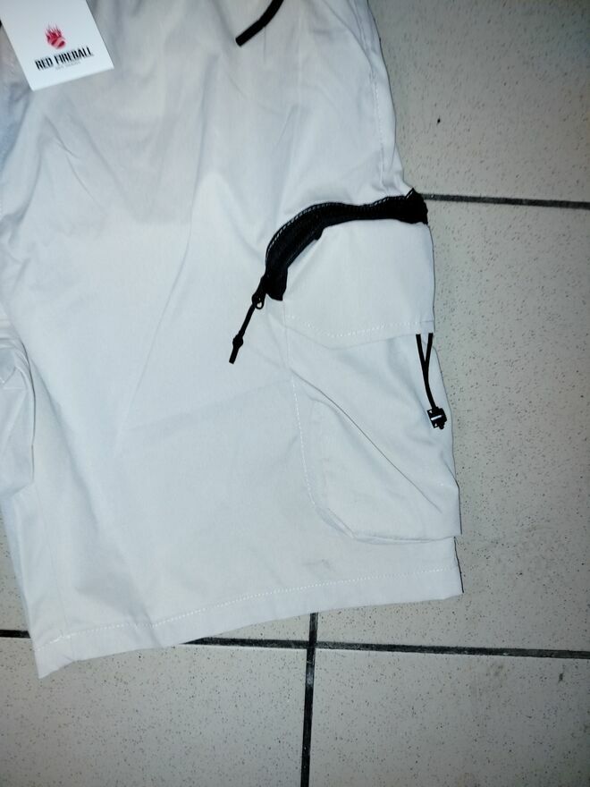 -Po prawej stronie spodenek są trzy kieszenie - jedna standardowa przy pasie / udzie bez zapięcia... druga jest na rzepy średniej wielkości oraz jedna malutka kieszeń na zamek / suwak ( np. na dokumenty )