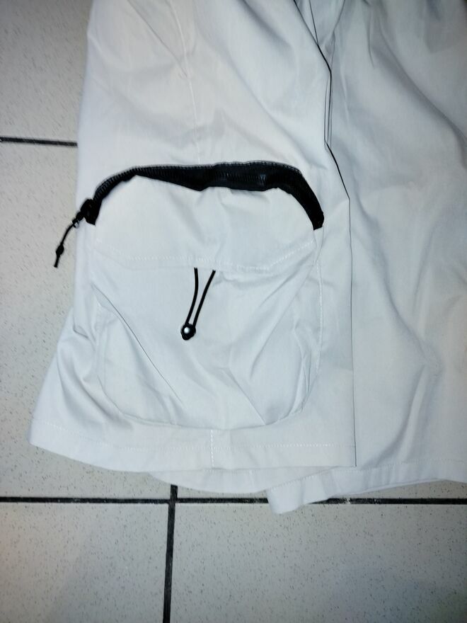 -Po prawej stronie spodenek są trzy kieszenie - jedna standardowa przy pasie / udzie bez zapięcia... druga jest na rzepy średniej wielkości oraz jedna malutka kieszeń na zamek / suwak ( np. na dokumenty )