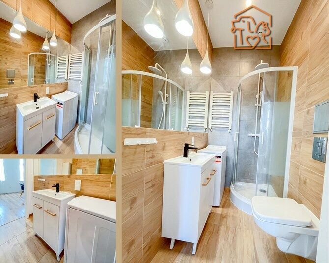 Łazienka: kabina prysznicowa, pralka, WC oraz umywalka