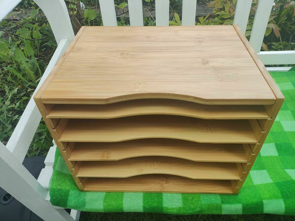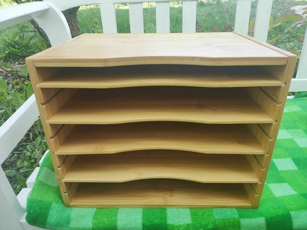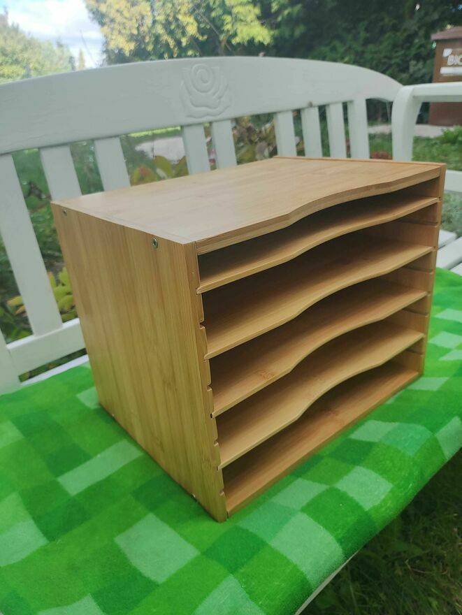 Solidny organizer na dokumenty lub teczki wykonany z bambusowego drewna. Posiada 5 poziomych półek, które pozwolą na wygodne przechowywanie i segregację dokumentów. Elegancki i funkcjonalny dodatek do biura lub domowego gabinetu.