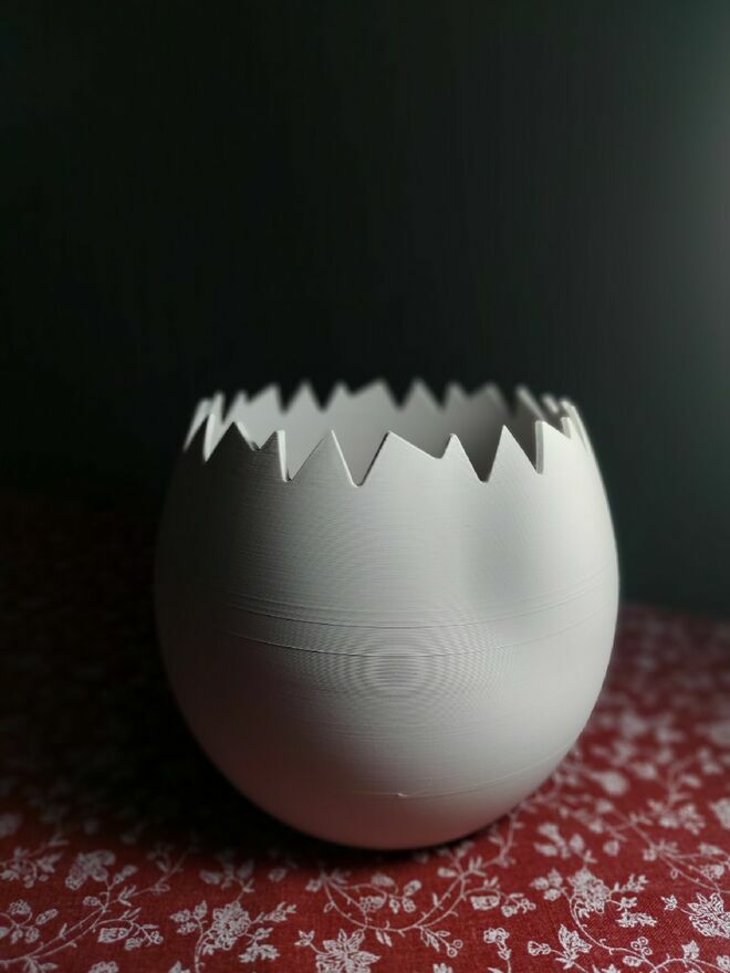 Jajko Wielkanocne – Doniczka do Rzeżuchy | Pęknięte Jajko | Wydruk 3DOryginalna i praktyczna ozdoba wielkanocna w formie jajka pękniętego w połowie, pełniąca funkcję doniczki do rzeżuchy lub innych drobnych roślin. To idealne połączenie świątecznej dekoracji z naturalną zielenią, która pięknie uzupełni wielkanocny stół, parapet lub komodę.