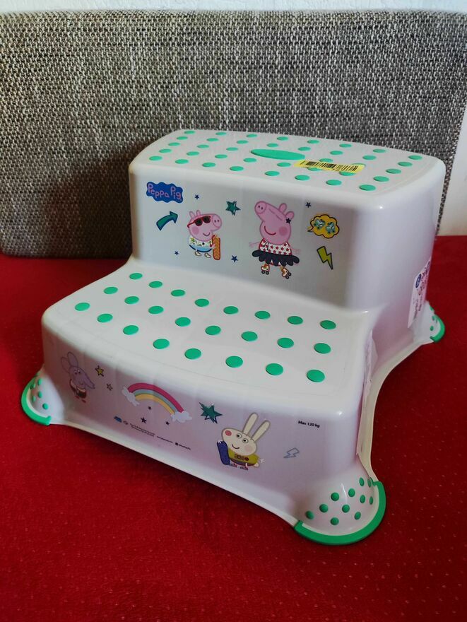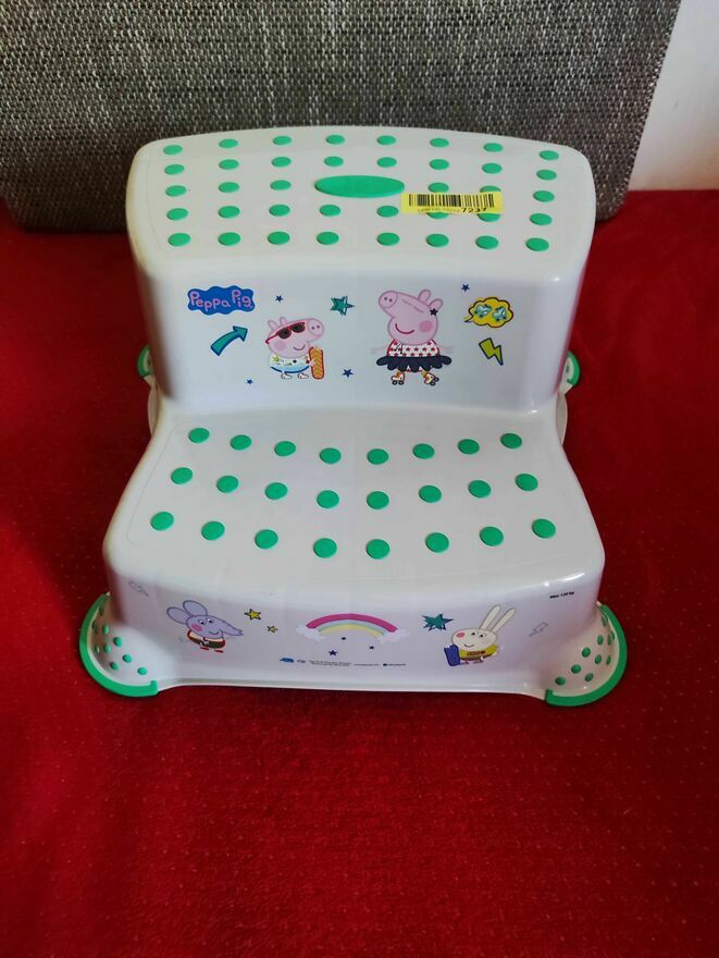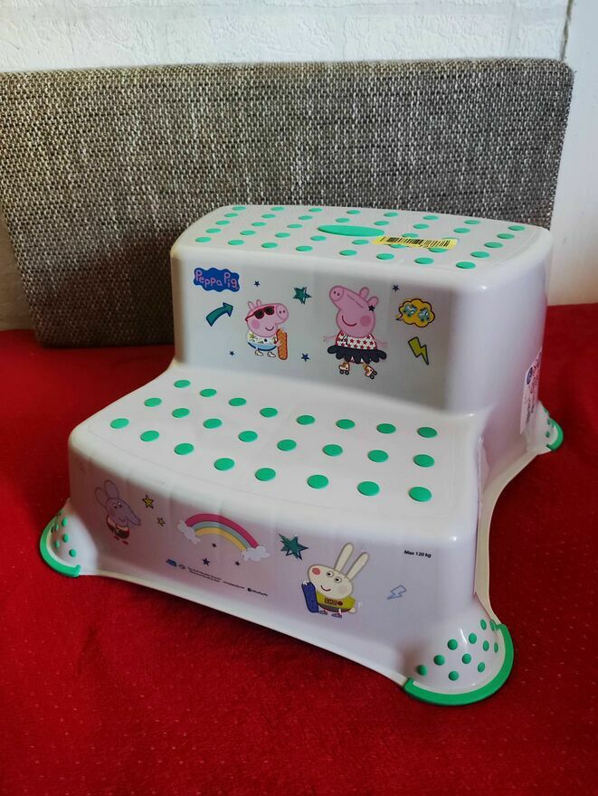 Podest dla dziecka dwustopniowy stołek z motywem Świnki Peppy. Idealny do użytku domowego. Solidna konstrukcja zapewnia bezpieczeństwo maluchowi podczas samodzielnego wchodzenia i schodzenia. Praktyczny i kolorowy dodatek do pokoju dziecięcego.Nowy.