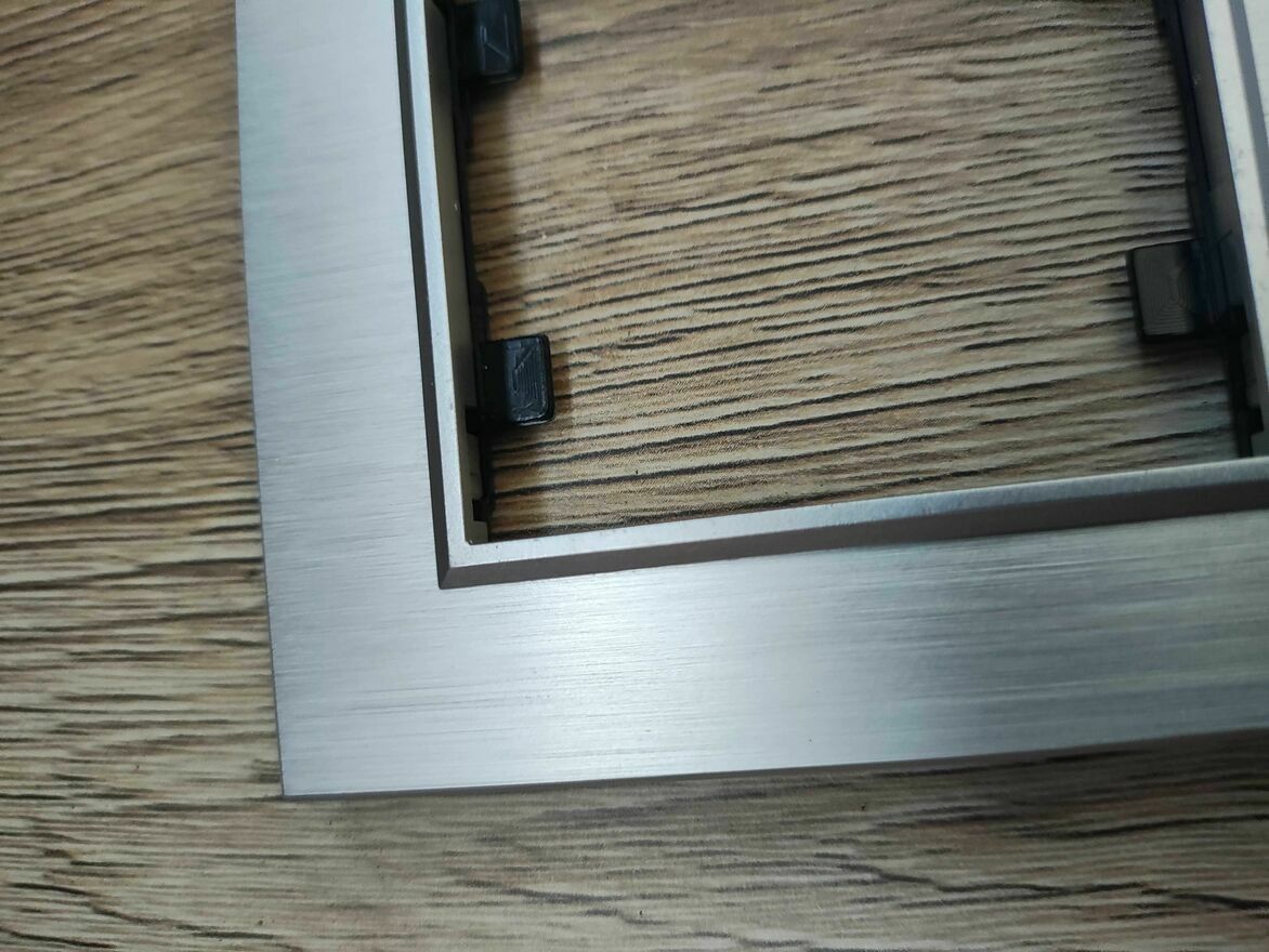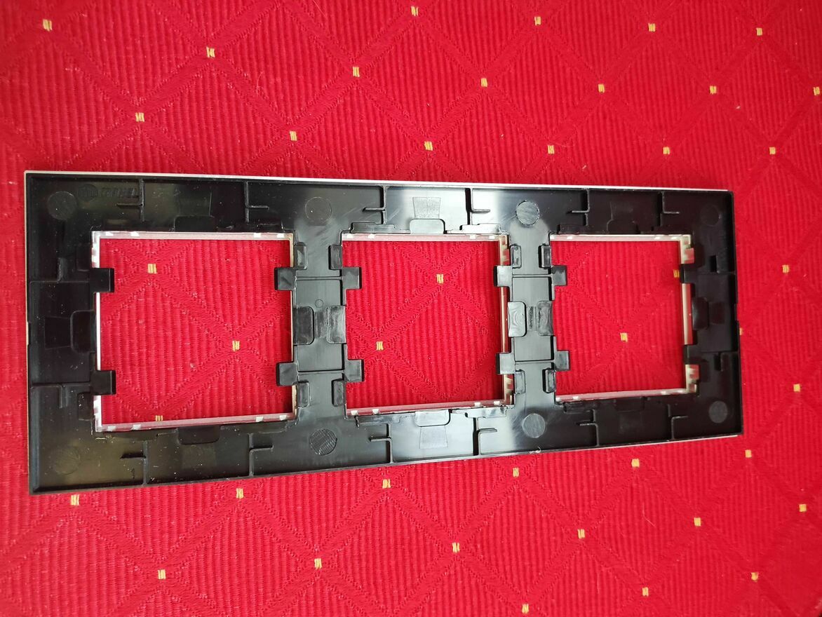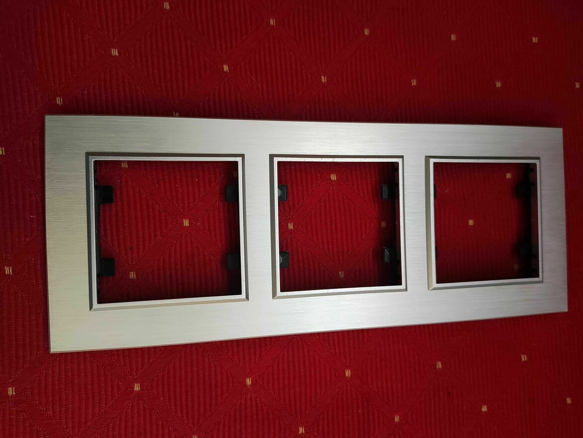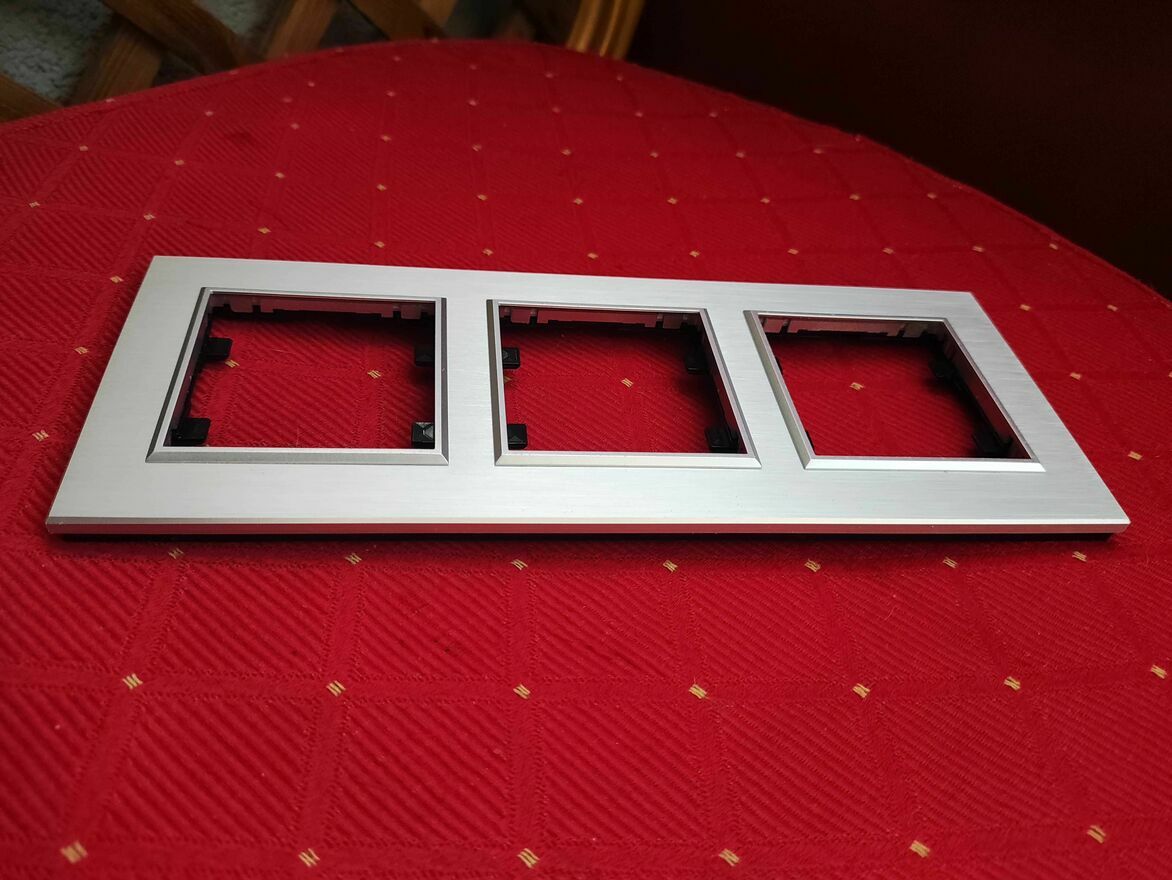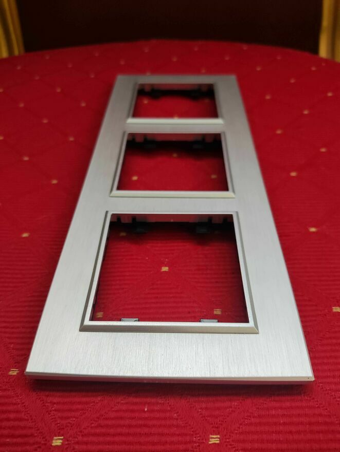 Srebrna, aluminiowa ramka maskująca 3-krotna do przełączników elektrycznych. Solidna i trwała konstrukcja zapewnia estetyczne wykończenie instalacji elektrycznej.