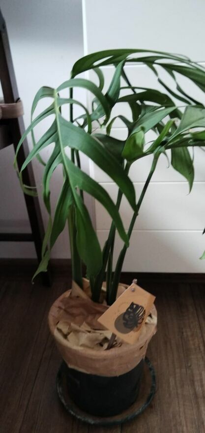 Rzadki okaz monstery Croatti - unikalna okazja. Zdrowa, dobrze rozwinięta roślina w oryginalnym drewnianym pojemniku. Idealna do uzupełnienia kolekcji lub jako prezent dla miłośnika roślin.40 cm, długość samej rośliny.
