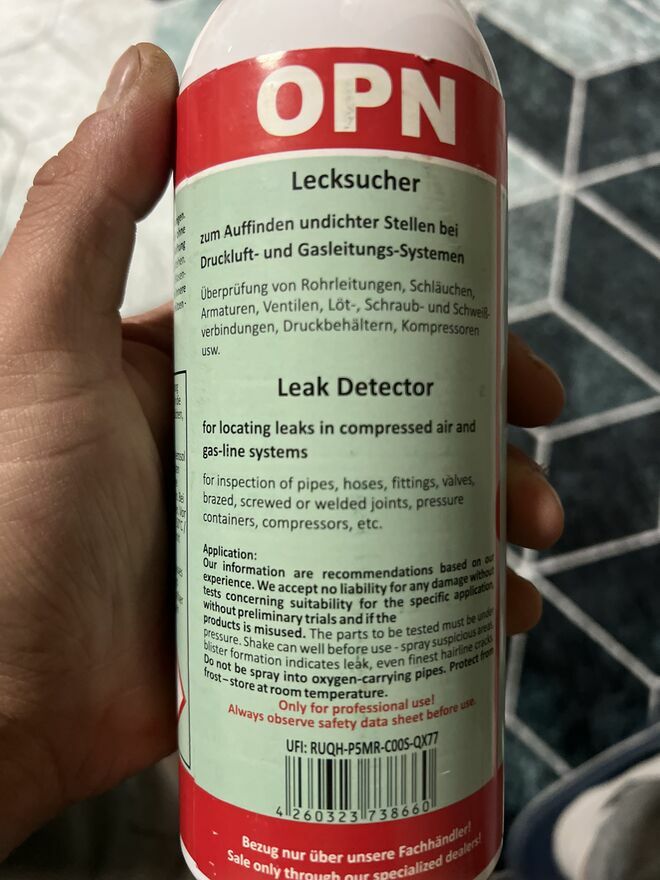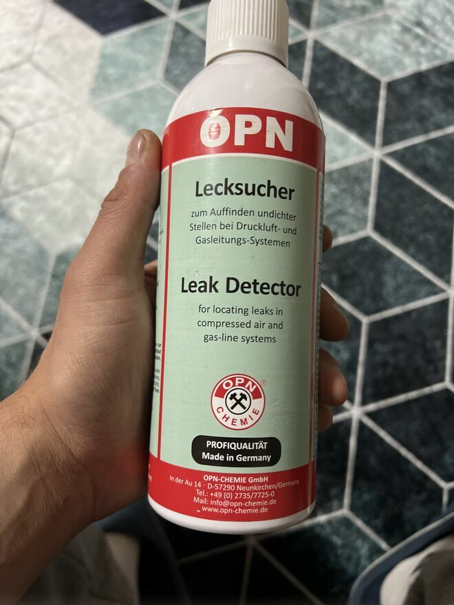 Nowy, oryginalny spray OPN Lecksucher / Leak Detector do wykrywania nieszczelności w systemach sprężonego powietrza i instalacjach gazowych.Wyprodukowany w Niemczech – profesjonalna jakość (Profiqualität).