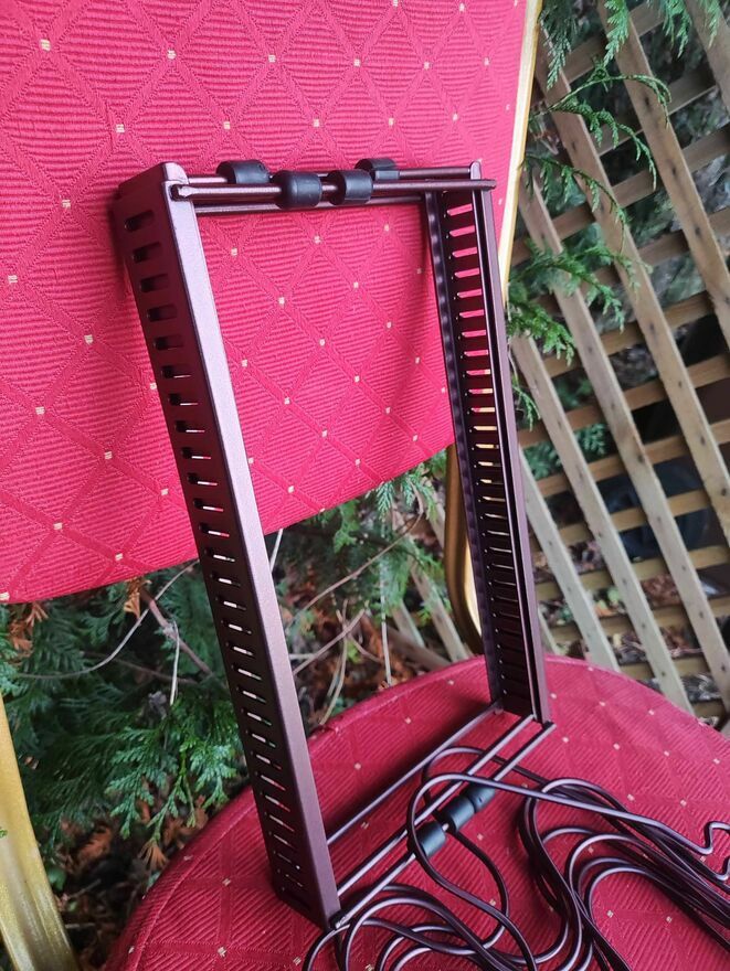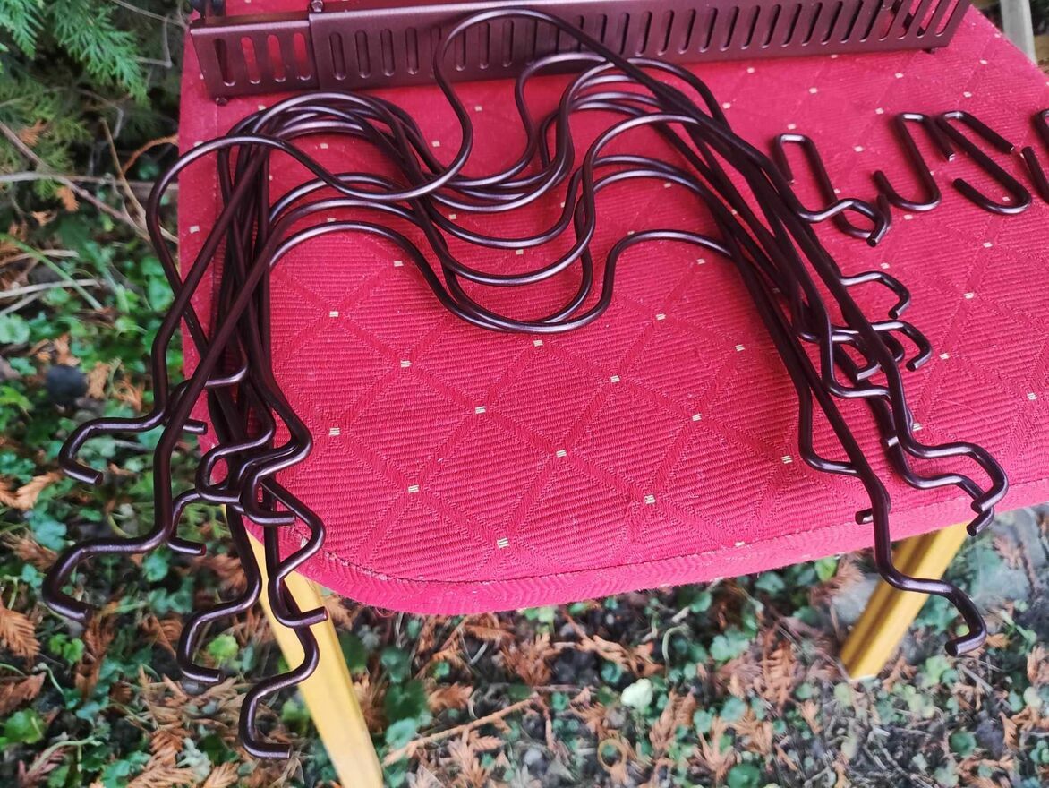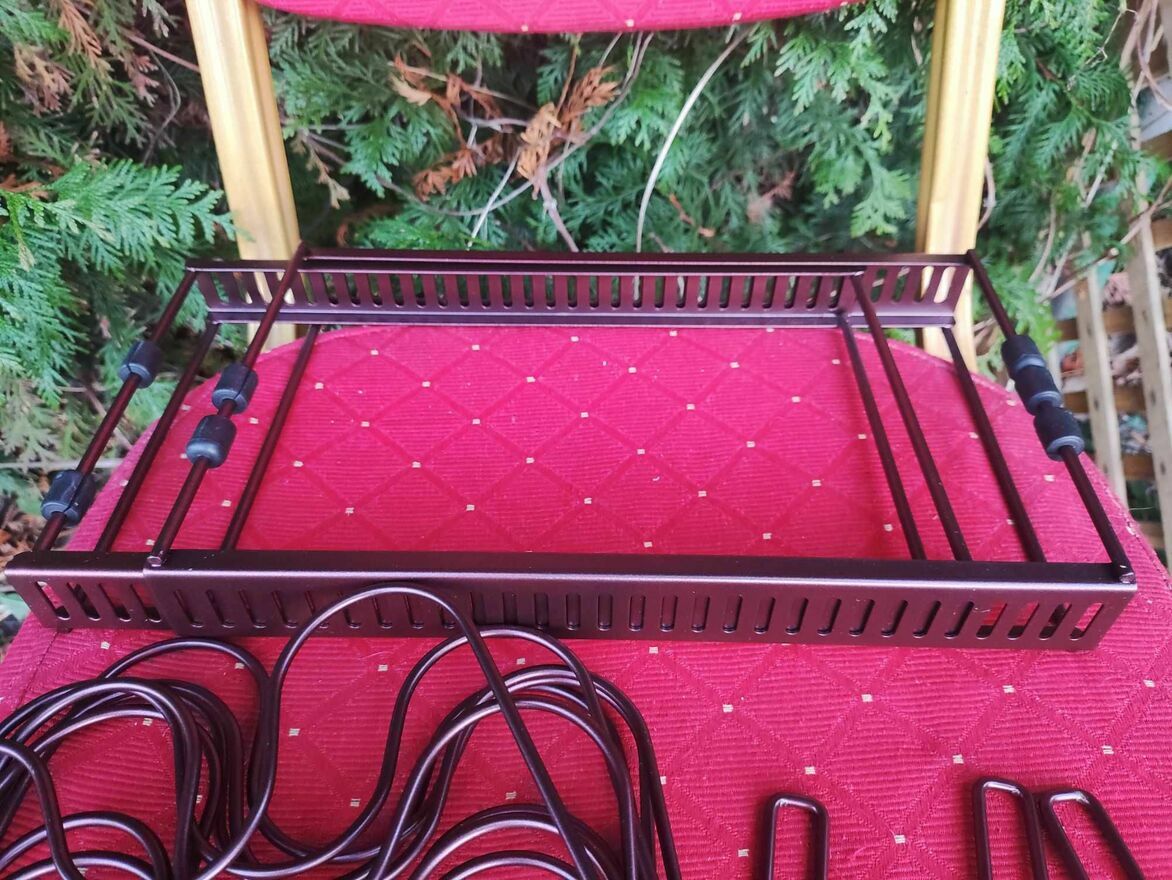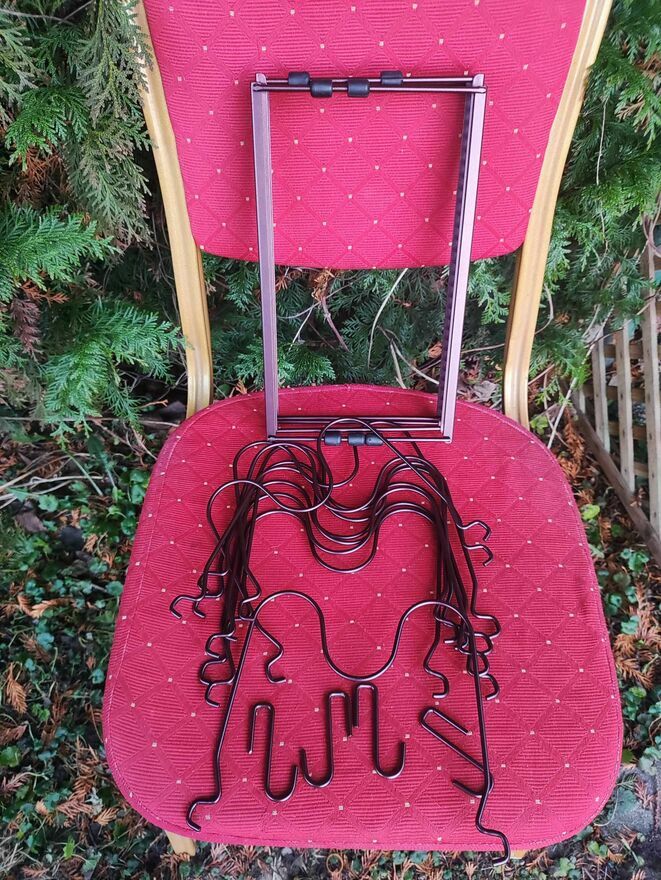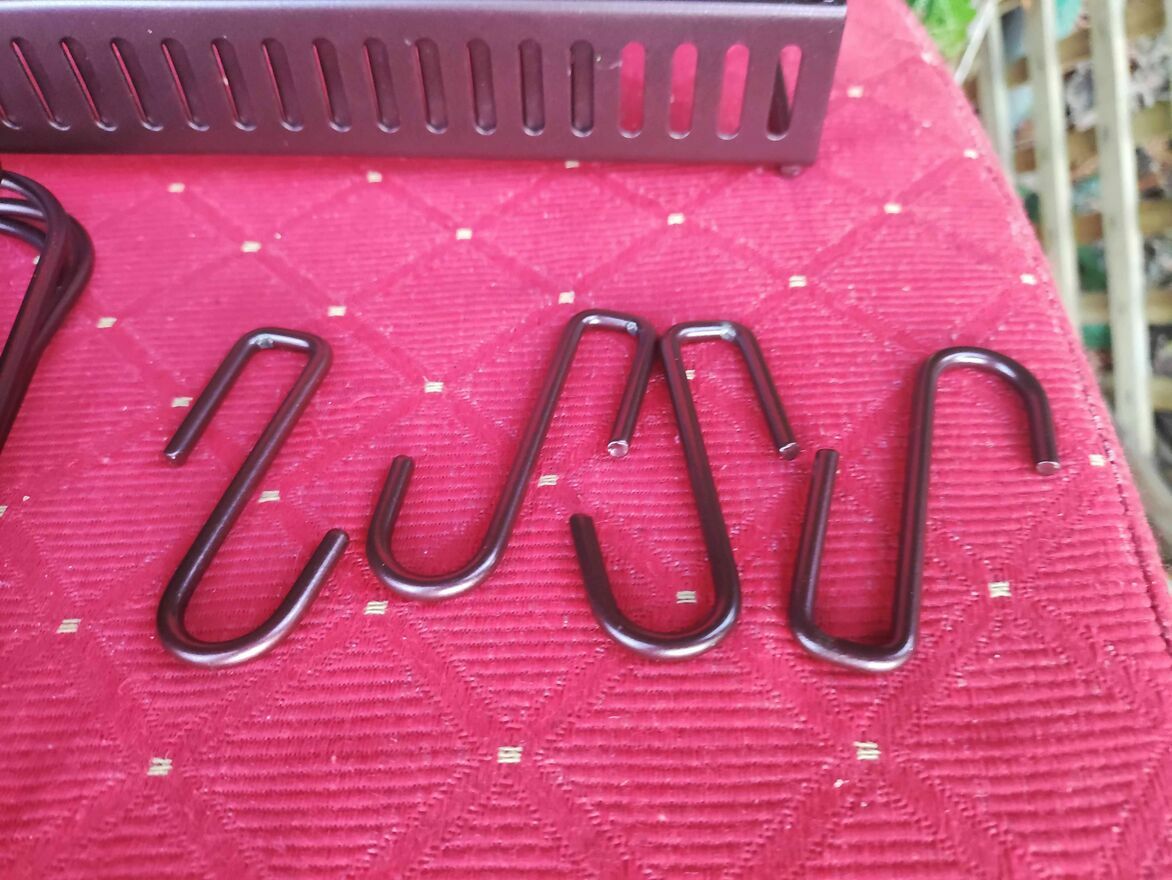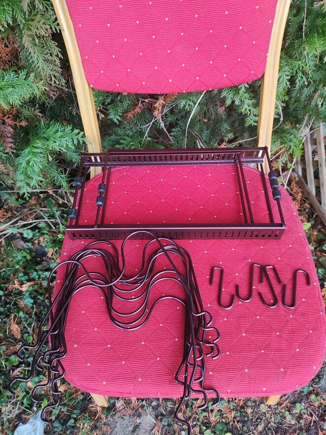 Nowy, metalowy stojak na garnki, patelnie i pokrywki w kolorze brązowym. Stojak ma półki na różne rozmiary naczyń kuchennych i jest ozdobiony czerwonym, wzorzystym materiałem. Praktyczny i stylowy dodatek do kuchni.Nowy.