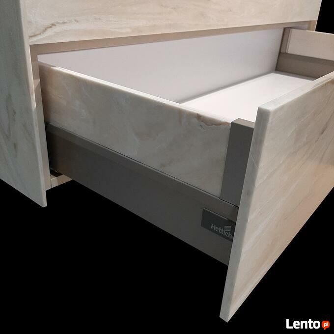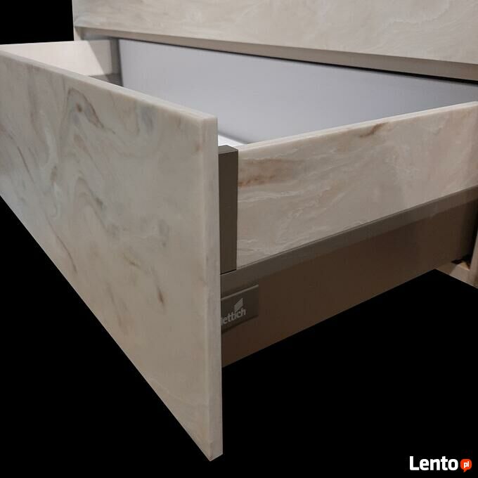wyposażenie: szuflada Hettich w kolorze szampańskim; boczki szuflady w kolorze Corian Dune Prima; sposób otwierania mechaniczny za dolną krawędź frontu