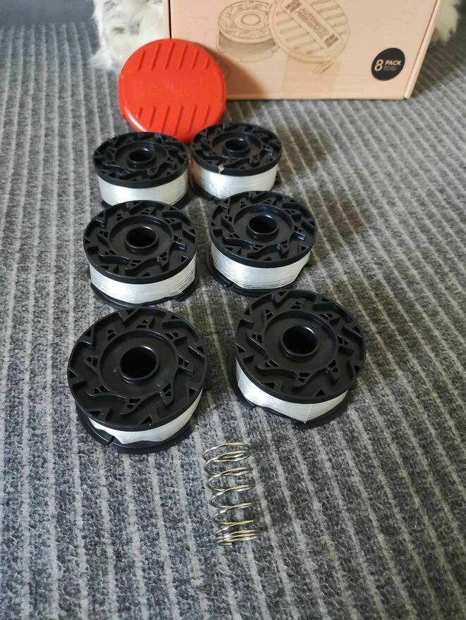 Nowy zestaw szpuli i sprężyny do podkaszarki Black+Decker. W zestawie znajduje się 6 czarnych szpul oraz czerwona pokrywa.