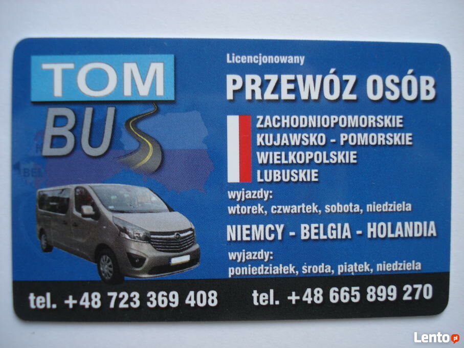 Tom-Bus Przewóz Osób Polska- Niemcy-Holandia -Belgia-Luksemburg-PolskaTom-Bus Z adresu pod adres.Bez przesiadek.Promocja karnet 6 + 1 przejazd gratis. Obsługujemy województwa kujawsko -pomorskie,wielkopolskie,lubuskie,zachodniopomorskieSprawdź zainteresowanie tym ogłoszeniem
