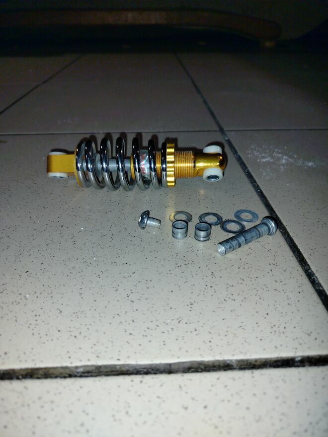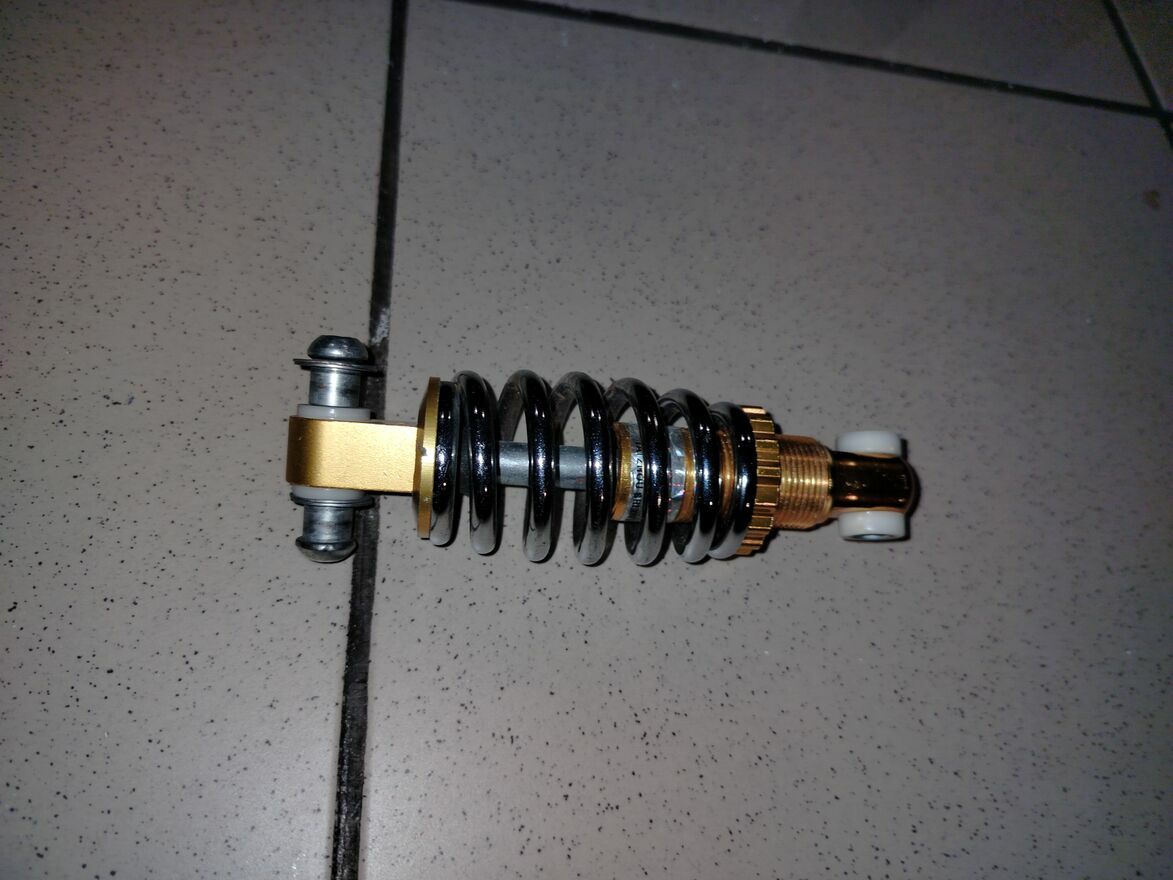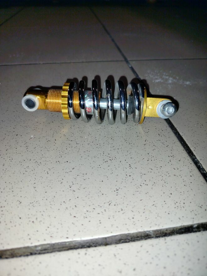 Tylny AMORTYZATOR motocyklowy lub do elektrycznego skutera rowerowego ( z MALUTKIM minusem - lecz bardzo łatwym do naprawienia - ponieważ amortyzator jest bez jednej śrubki , podkładek, nakrętki - WIDOCZNE na zdjęciu )