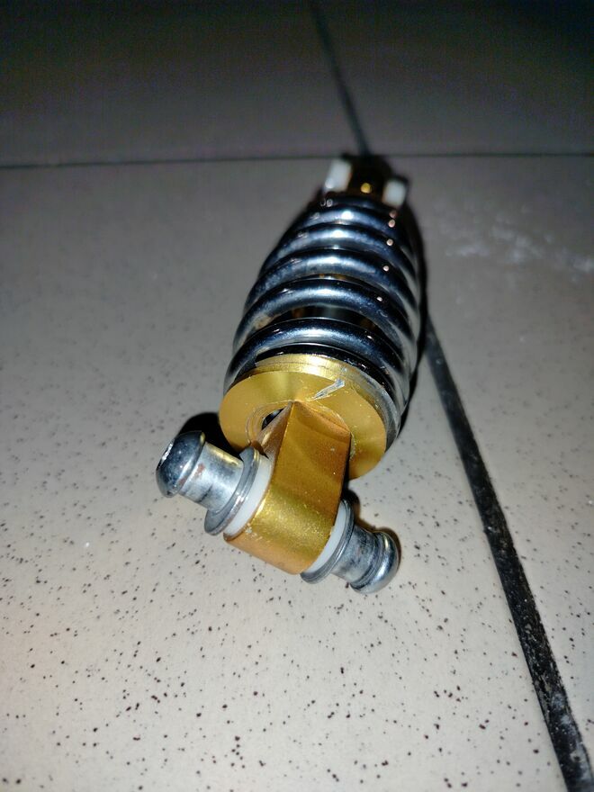 Tylny AMORTYZATOR motocyklowy lub do elektrycznego skutera rowerowego ( z MALUTKIM minusem - lecz bardzo łatwym do naprawienia - ponieważ amortyzator jest bez jednej śrubki , podkładek, nakrętki - WIDOCZNE na zdjęciu )