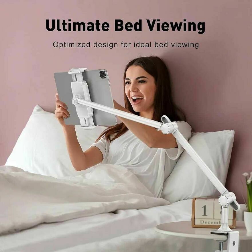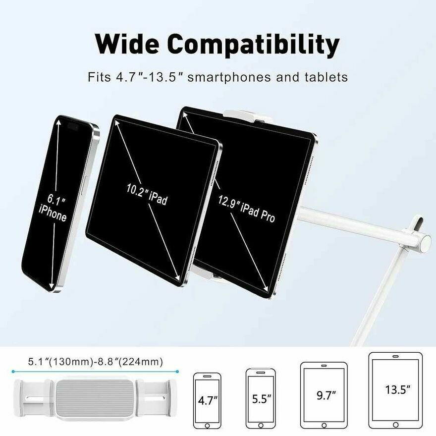 Elastyczny uchwyt na tablet z długim ramieniem – regulowany i wielofunkcyjny stojak odpowiedni do padów, tabletów i innych urządzeń w eleganckim białym wykończeniu