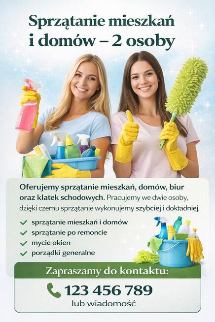 Dzień dobry, oferujemy sprzątanie mieszkań, domów, biur oraz klatek schodowych. Jesteśmy dwiema dokładnymi i ...
