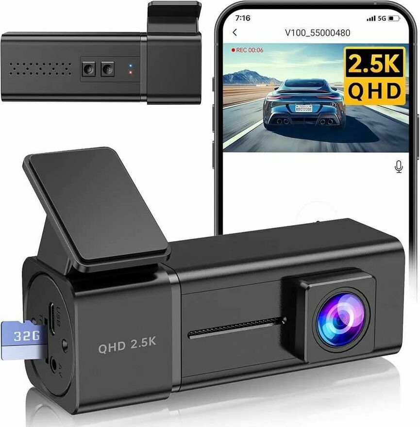 Kamera samochodowa Veement 2,5k 1440P WiFi, kamera samochodowa z aplikacją, mini kamera samochodowa, darmowa karta SD 32 GB, noktowizor, tryb