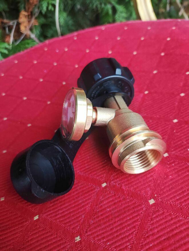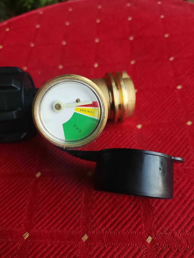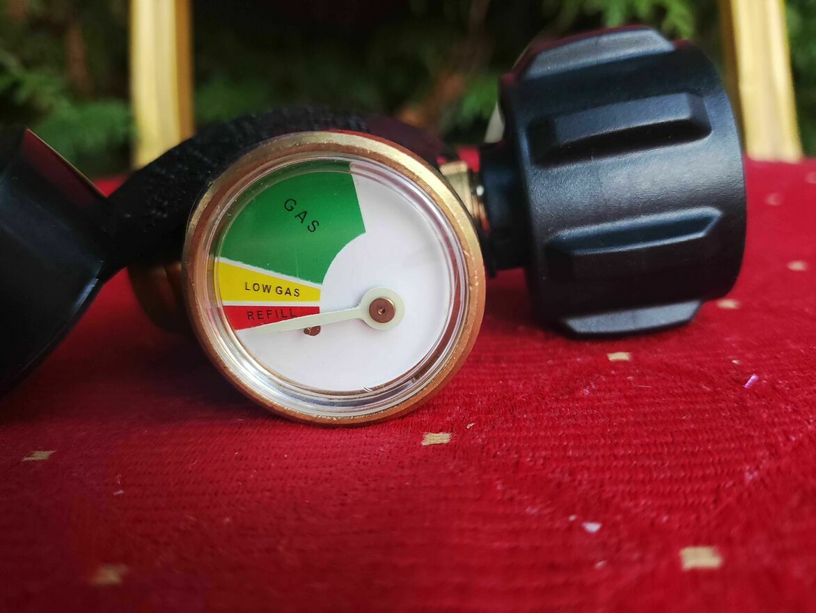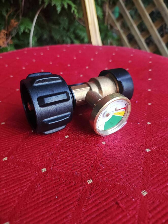 Nowy manometr do butli z gazem propanowym, służący do kontroli ciśnienia w cylindrze. Umożliwia bezpieczne użytkowanie i napełnianie butli gazowej.Nowy.