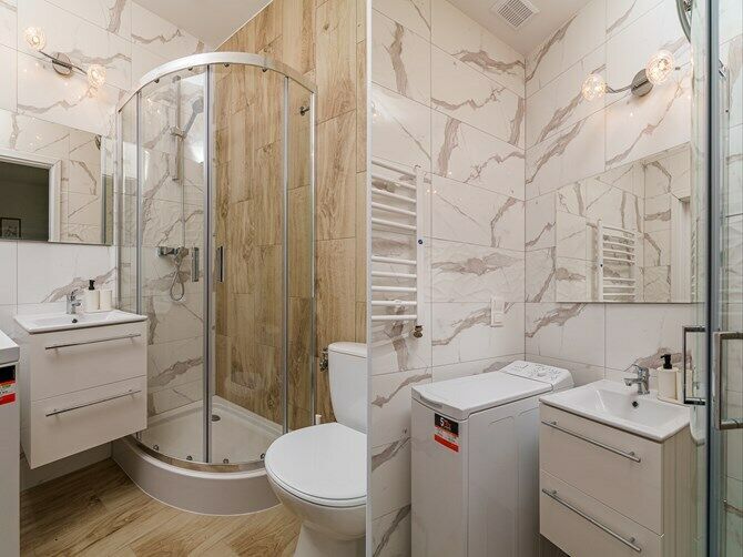 Łazienka: kabina prysznicowa, WC, umywalka, pralka
