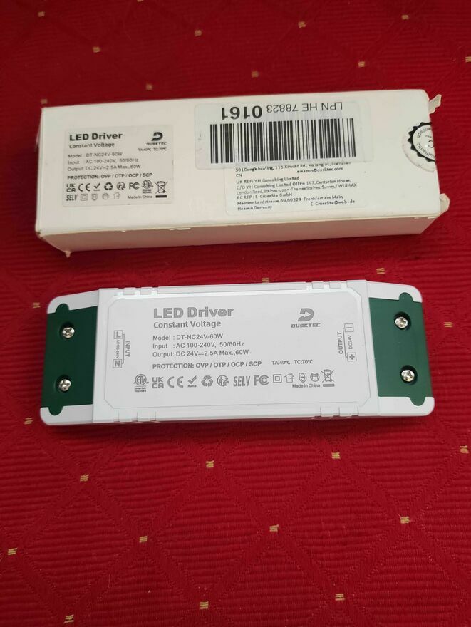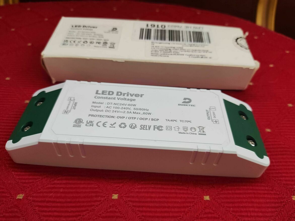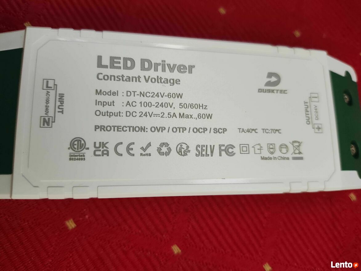 Zasilacz LED marki DUSKTEC o mocy 24V i 60W, idealny do podłączenia taśm LED, lamp czy reflektorów.Nowy.