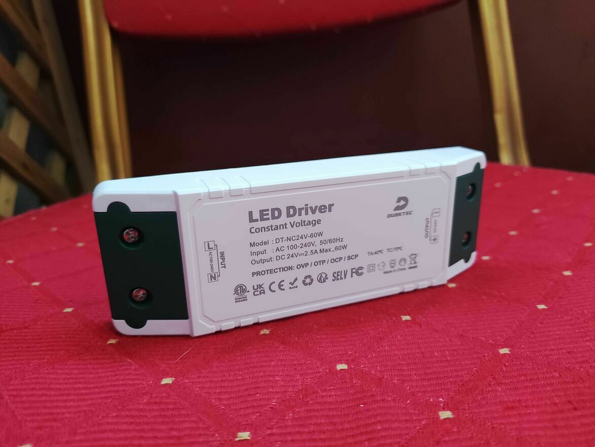 Wejście AC 100-240 V, 50/60 Hz, stałe napięcie DC wyjściowe: 24V, prąd wyjściowy: 2500 mA. Maksymalne obciążenie: 60 watów. Wymiary: 140 * 45 * 27 mm; Nie nadaje się do regulacji jasności.
