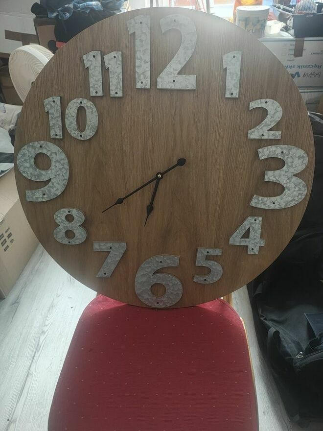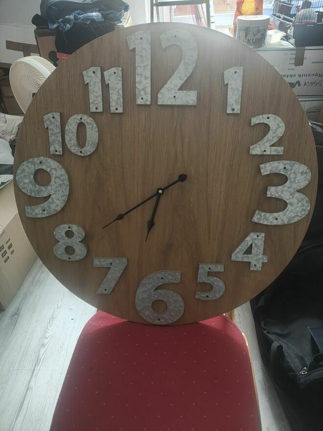 Sprzedam Duży, drewniany zegar ścienny w kolorze brązowym. Zegar ma wyraźne, duże cyfry i wskazówki, które ułatwiają odczytywanie godziny. Produkt jest nowy i gotowy do zawieszenia na ścianie, aby dodać elegancki akcent do każdego wnętrza.Wymiary